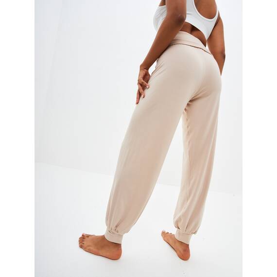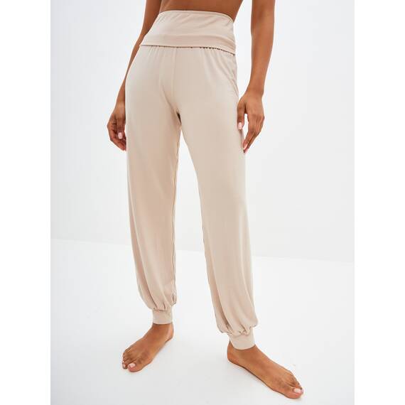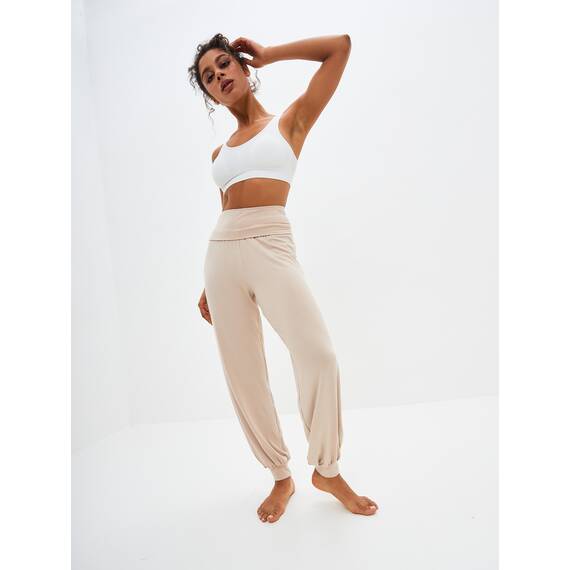Широкие бежевые брюки-гаремы из мягкой натуральной ткани создают легкий и выразительный силуэт, подчёркивая талию и обеспечивая абсолютную свободу движений. Благодаря воздушной фактуре материал красиво струится, не утяжеляет образ и комфортно ощущается на коже даже в жаркую погоду.