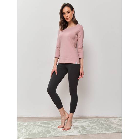 Оптимальная длина до середины бедра и приталенный крой помогают лонгсливу надежно удерживаться на месте: он не задирается при наклонах, растяжках и перевернутых асанах. Рукава длиной 7/8 оставляют запястья свободными, что особенно удобно в динамичных комплексах. А изящная горловина «лодочка» подчеркивает линию шеи и ключицы.