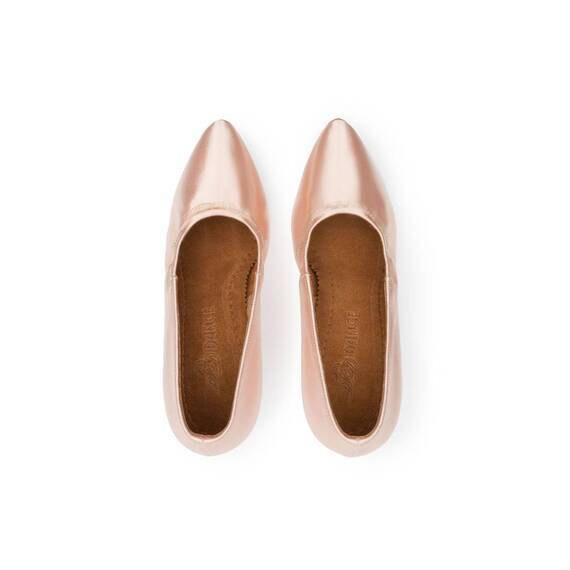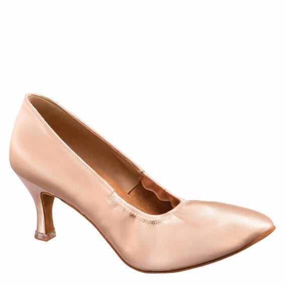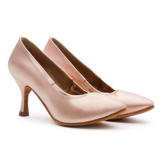 Женские туфли BD Dance 107 разработаны для европейской программы спортивных бальных танцев. Верх выполнен из гладкого сатина в бежевом или белом цвете, создающего изысканный сценический образ и подчёркивающего линию стопы. Круглый вырез придаёт обуви классическую форму и обеспечивает плотное прилегание без давления. Замшевая подошва обеспечивает плавное скольжение и контроль движений на паркете. Мягкий супинатор амортизирует нагрузку, снижая утомляемость стопы и поддерживая комфорт даже во время длительных репетиций. Модель выполнена без застёжки — туфли мягко обхватывают ногу и не спадают при активных движениях. Каблуки высотой 55, 65 или 75 мм позволяют выбрать оптимальный баланс устойчивости и элегантности. Укреплённый задник защищает от натирания.