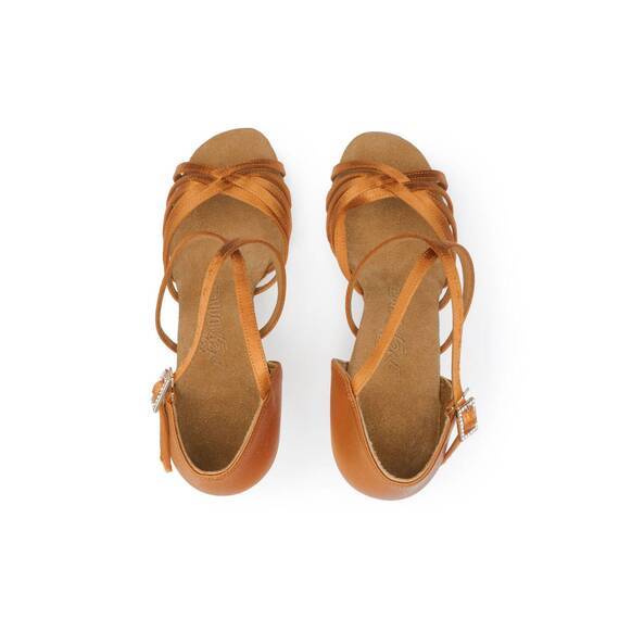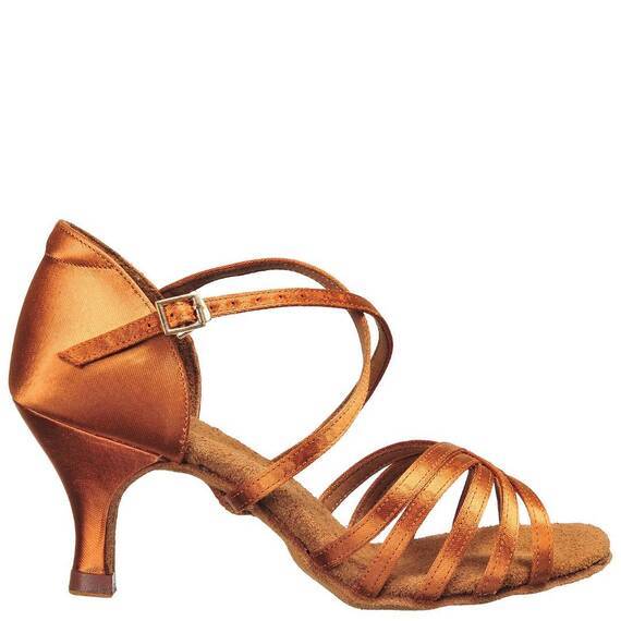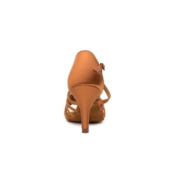 Туфли женские, латина,  модель 216 из сатина фирмы BD Dance для латиноамериканской программы спортивных бальных танцев с замшевой подошвой. Основной материал – сатин. Cоюзка представлена элегантным сплетением тонких ремешков. Цвет бронзовый.