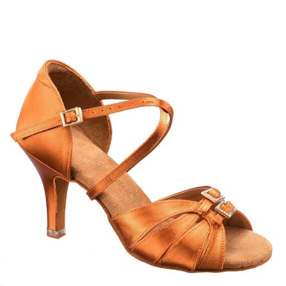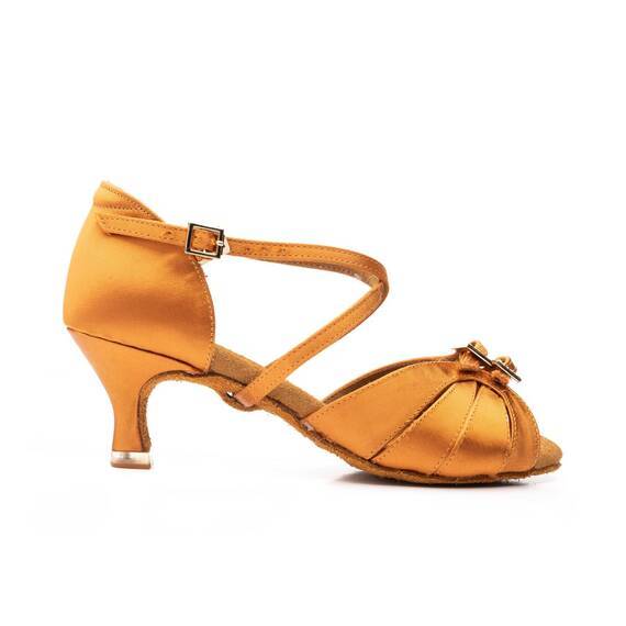 Женские туфли BD Dance 2307 созданы для латиноамериканской программы спортивных бальных танцев. Выполненные из сатина бронзового оттенка, они мягко отражают свет и подчёркивают выразительность движений. Классическое X-образное крепление и почти полностью закрытая союзка обеспечивают надёжную фиксацию стопы, помогая сохранить устойчивость даже при быстрых вращениях. Замшевая подошва гарантирует плавное скольжение и уверенный контроль движений на паркете. Модель представлена с каблуками 5,5 см формы клеш и 8,5 см формы Slim, что позволяет подобрать оптимальную высоту под уровень подготовки и стиль исполнения. Укороченный супинатор и гибкая подошва обеспечивают комфорт и естественную подвижность стопы во время танца.