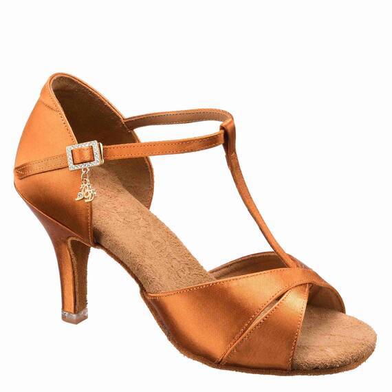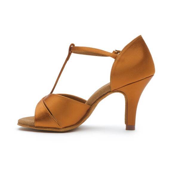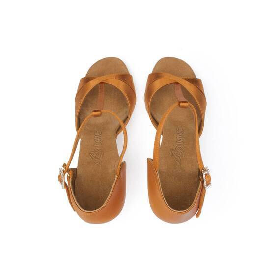 Женские туфли BD Dance 2358 предназначены для латиноамериканской программы спортивных бальных танцев. Верх выполнен из сатина бронзового оттенка, подчёркивающего движение и создающего эффект мягкого блеска на паркете. Классическое Т-образное крепление и почти полностью закрытая союзка обеспечивают надёжную фиксацию стопы и устойчивость при выполнении быстрых комбинаций. Замшевая подошва способствует плавному скольжению и точному контролю вращений. Каблук Slim высотой 8,5 см визуально вытягивает ногу и придаёт танцу лёгкость и выразительность. Укороченный супинатор и мягкая конструкция подошвы поддерживают естественную гибкость стопы, снижая нагрузку во время интенсивных выступлений. Модель сочетает элегантность, комфорт и стабильность, подходя как для тренировок, так и для соревнований.
