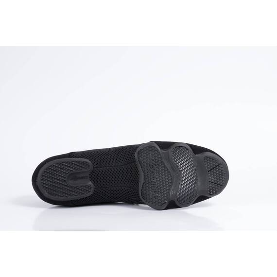 Джазовки BD Dance созданы для тренировок, репетиций и постановок, требующих лёгкости и контроля движений. Особая конструкция подошвы позволяет танцору свободно переходить от скольжения к точной фиксации. Носочная часть разделена на три зоны: две прорезиненные области обеспечивают устойчивость и сцепление с паркетом, а центральная пластиковая вставка позволяет выполнять плавные скользящие движения. Такая комбинация материалов делает обувь универсальной для различных стилей — от джаза и модерна до сценических номеров. Лёгкий верх адаптируется к форме стопы, обеспечивая гибкость и комфорт в динамике. Джазовки BD Dance — это удобная, функциональная обувь для танцоров, ценящих контроль и свободу движения.