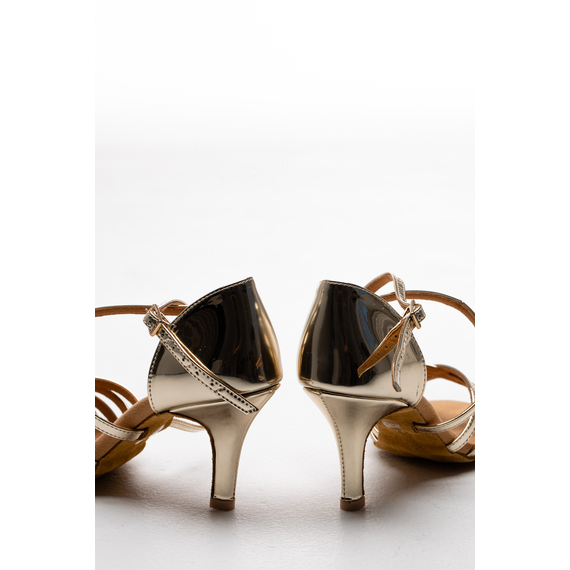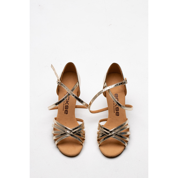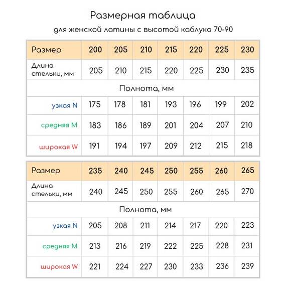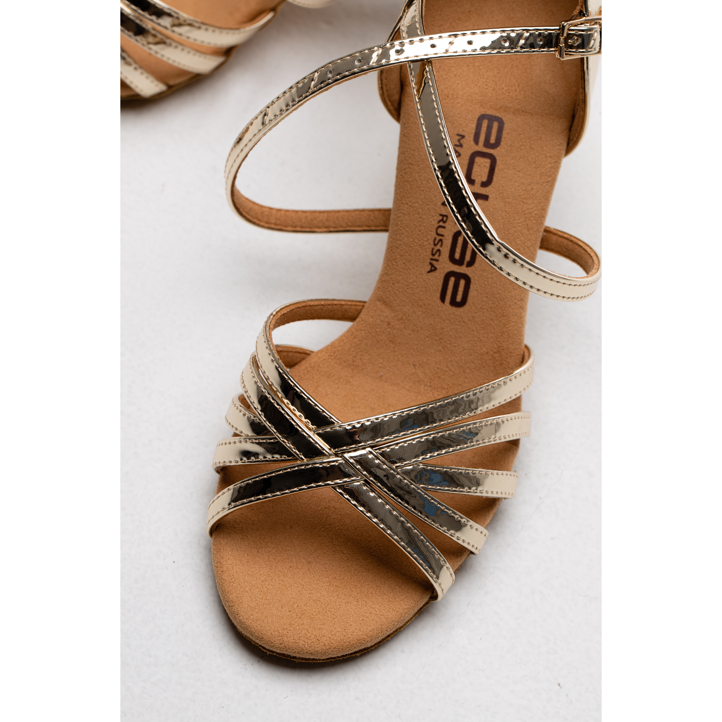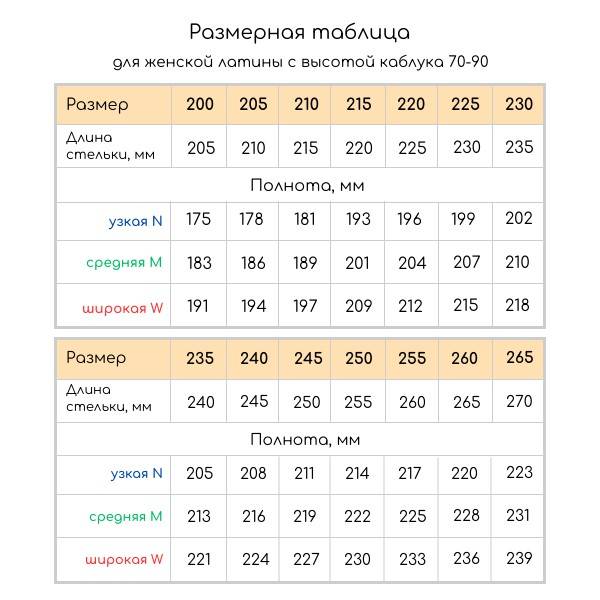 Женские туфли для латиноамериканской программы спортивных бальных танцев выполнены из искусственной лаковой кожи с глянцевым финишем, который подчёркивает движения и усиливает сценический эффект. Ремешковая конструкция союзки формирует лёгкий визуальный силуэт и обеспечивает стабильную фиксацию стопы в динамике. Замшевая подошва даёт контролируемое скольжение и уверенное сцепление с паркетом, что важно для точных вращений и быстрых связок. Модель доступна в средней и широкой полноте, что позволяет подобрать оптимальную посадку для разной ширины стопы и подъёма. Высота каблука указана для среднего размера и может незначительно варьироваться в зависимости от длины стопы. Длина стельки превышает номинальный размер примерно на 0,5 см, обеспечивая комфортную посадку. Подходит для тренировок, выступлений и сценических образов