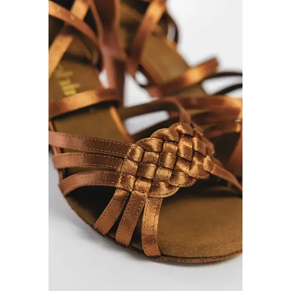 Женские босоножки для латиноамериканской программы с плетением «Косичка» разработаны для выразительной подачи и уверенного контроля движений на паркете. Декоративное переплетение в сочетании с V-образным ремешком подчёркивает подъём стопы, визуально удлиняет линию ноги и обеспечивает стабильную фиксацию при активной и быстрой работе в латине. Конструкция поддерживает стопу в поворотах, акцентах и сменах направления.