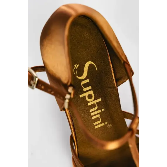 Верх выполнен из сатина, который подчёркивает линию ноги, красиво отражает сценический свет и гармонично сочетается с конкурсными и тренировочными костюмами. Материал мягкий, комфортный и подходит для продолжительных занятий. Замшевая подошва обеспечивает оптимальное сцепление с паркетом, сохраняя чувствительность и точность движений.