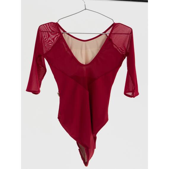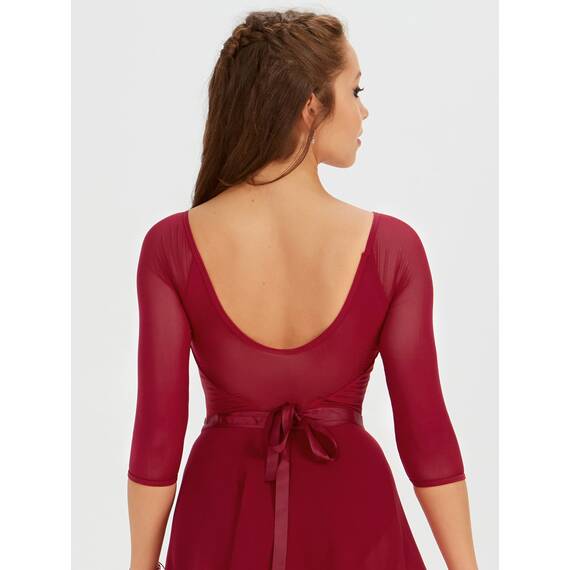 Элегантный хореографический купальник с открытой спиной создан для танцев, балета и гимнастики, подчеркивая женственный силуэт и изящные линии тела. Модель выполнена в классическом бордовом цвете и дополнена полупрозрачными сетчатыми вставками, которые придают образу легкость и утонченность.