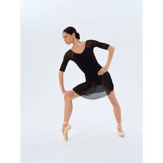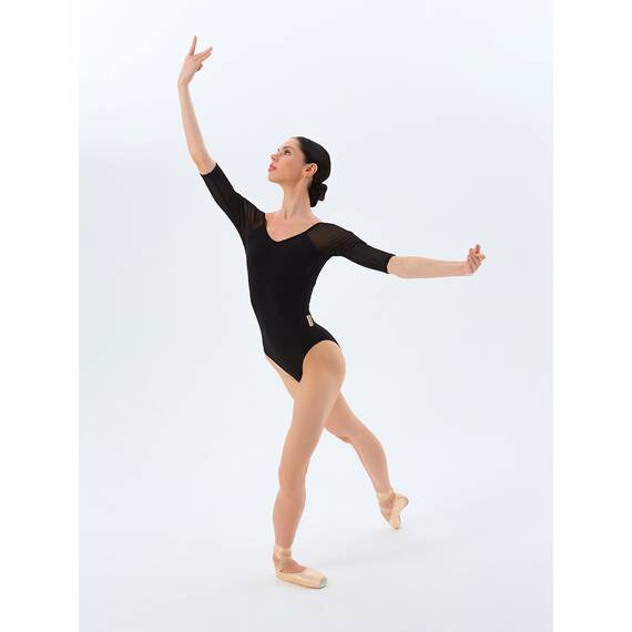 Элегантный хореографический купальник с открытой спиной создан для танцев, балета и гимнастики, подчеркивая женственный силуэт и изящные линии тела. Модель выполнена в классическом черном цвете и дополнена полупрозрачными сетчатыми вставками, которые придают образу легкость и утонченность.