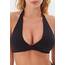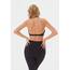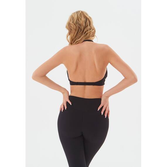Конструкция с открытой спиной и бретелью через шею подчеркивает линию плеч и визуально облегчает силуэт, сохраняя при этом надежную поддержку груди. Декоративная скрутка в зоне V-образного выреза аккуратно приподнимает грудь и формирует привлекательное декольте.
