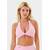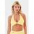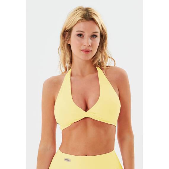 Конструкция с открытой спиной и бретелью через шею подчеркивает линию плеч и визуально облегчает силуэт, сохраняя при этом надежную поддержку груди. Декоративная скрутка в зоне V-образного выреза аккуратно приподнимает грудь и формирует привлекательное декольте.
