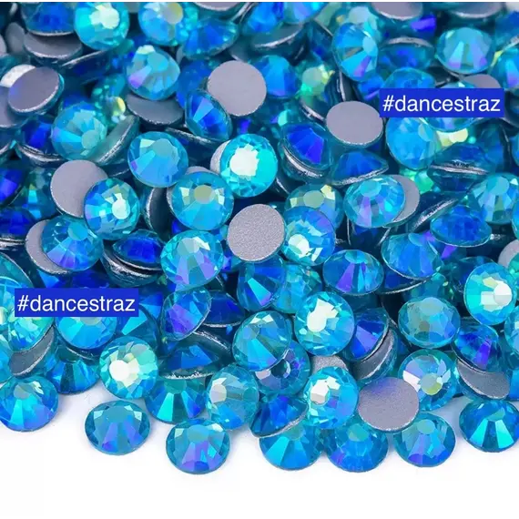 Стразы клеевые Aquamarine AB подходят для ярких сценических образов: бальные и латинские программы, сальса, бачата, high-heels, гимнастика, фигурное катание и шоу-номера. Перелив AB дает холодное голубое сияние с легкими лазурными отблесками и хорошо читается в софитах и при движении.