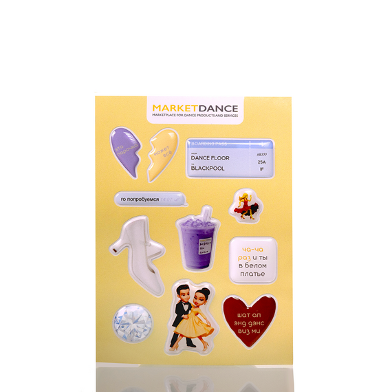 • Чёрные листы: сюда записывается то, что хочется забыть. После записи чёрный лист рекомендовано оторвать и избавиться от него любым способом. - Стикер-пак. Танцевальные наклейки для дневников, бутылок, чехлов для телефонов и чемоданов. Линейка пополняется под разные направления. В данном наборе больше всего подходит под бальные танцы