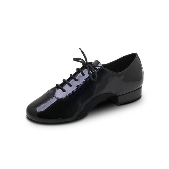Мужские туфли для стандартной программы из натурального лака черного цвета с сетчатой вставкой под сводом стопы для улучшенной вентиляции и ощущения легкости. Раздельная подошва обеспечивает гибкость при выполнении стандартных танцевальных элементов, а колодка фиксирует стопу для стабильной посадки. Каблук низкий, устойчивый, подходящий для репетиций и выступлений