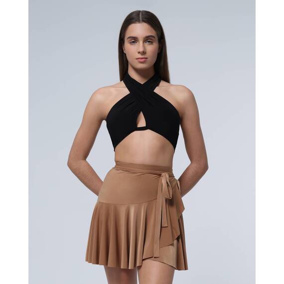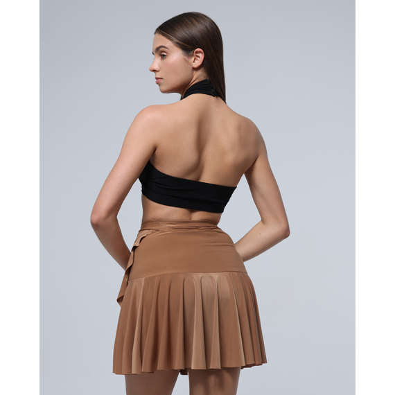 Акцентным элементом дизайна является конструкция с петлей вокруг шеи (halter), которая фиксируется сзади с помощью удобных кнопок. Такая посадка подчеркивает линию плеч и спины, создавая современный и выразительный образ. Топ плотно прилегает к телу, обеспечивая уверенность и свободу движений на протяжении всей тренировки