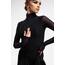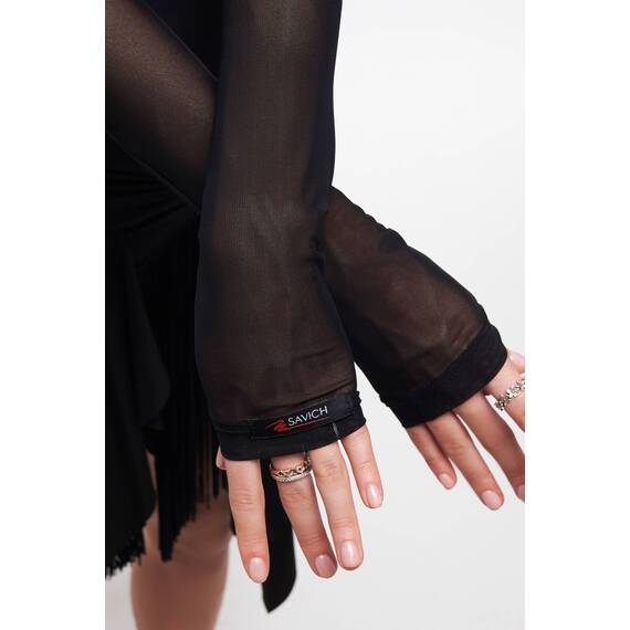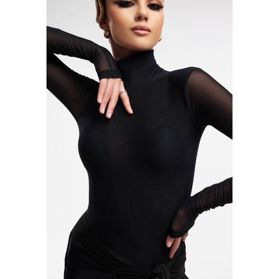 Элегантное черное боди из тонкой эластичной сетки создано для максимального комфорта и выразительного образа во время тренировок и выступлений. Модель с удлинёнными рукавами и высокой горловиной подчёркивает линию плеч и шеи, создавая утончённый силуэт.