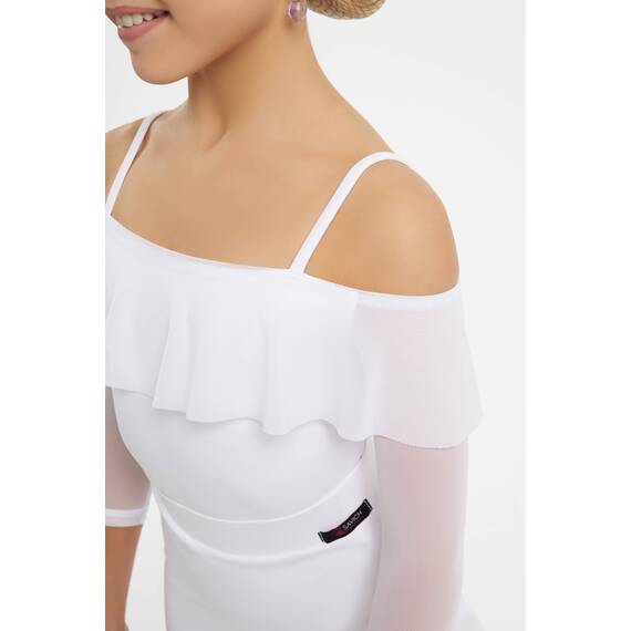 Элегантное белое боди из плотного эластичного трикотажа станет универсальной основой для тренировочного или сценического образа. Модель выполнена на тонких бретелях, которые обеспечивают комфортную посадку и не сковывают движения во время танцев и занятий хореографией. Материал мягко прилегает к телу, подчёркивая силуэт и сохраняя идеальную форму в процессе активности.