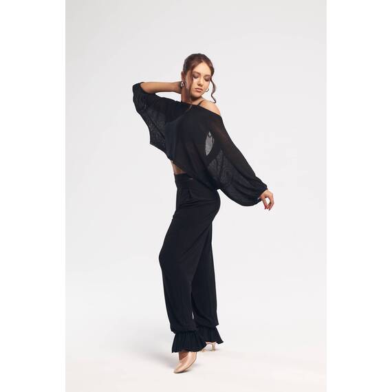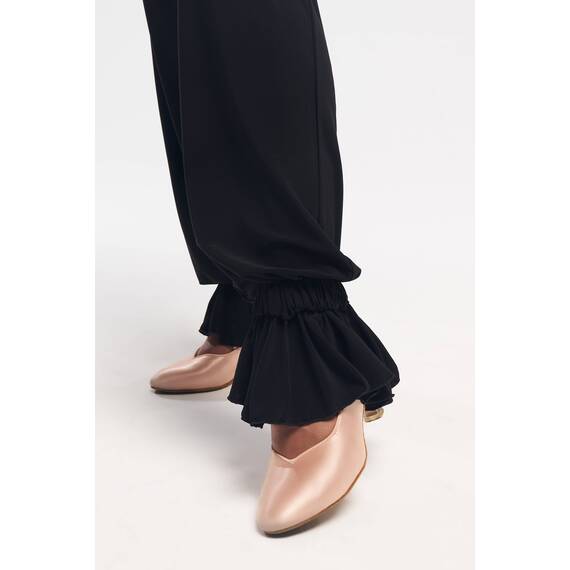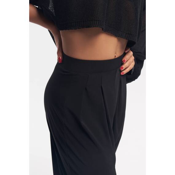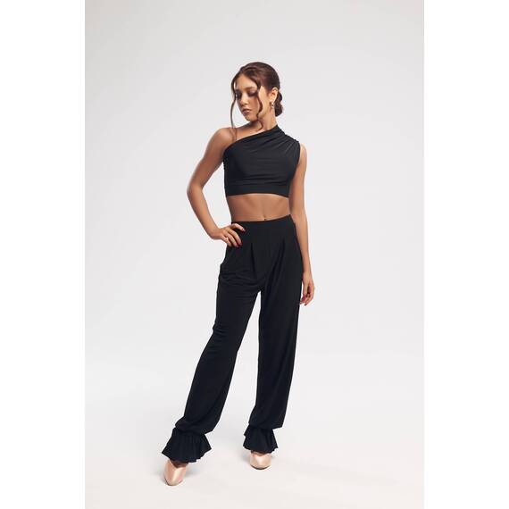Широкий плотный пояс обеспечивает надежную фиксацию и визуально подчеркивает талию, формируя аккуратный силуэт. Манжеты внизу брючин создают эффект вытянутых ног и добавляют образу изящества. Особенность модели — возможность носить брюки как с манжетами, так и с завернутым внутрь краем, адаптируя посадку под настроение и стиль.