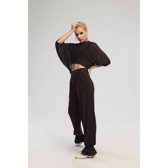 Широкий плотный пояс обеспечивает надежную фиксацию и визуально подчеркивает талию, формируя аккуратный силуэт. Манжеты внизу брючин создают эффект вытянутых ног и добавляют образу изящества. Особенность модели — возможность носить брюки как с манжетами, так и с завернутым внутрь краем, адаптируя посадку под настроение и стиль.