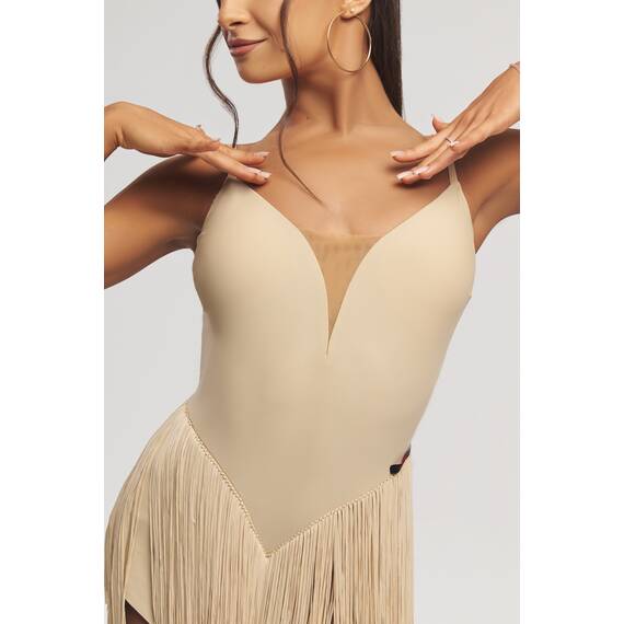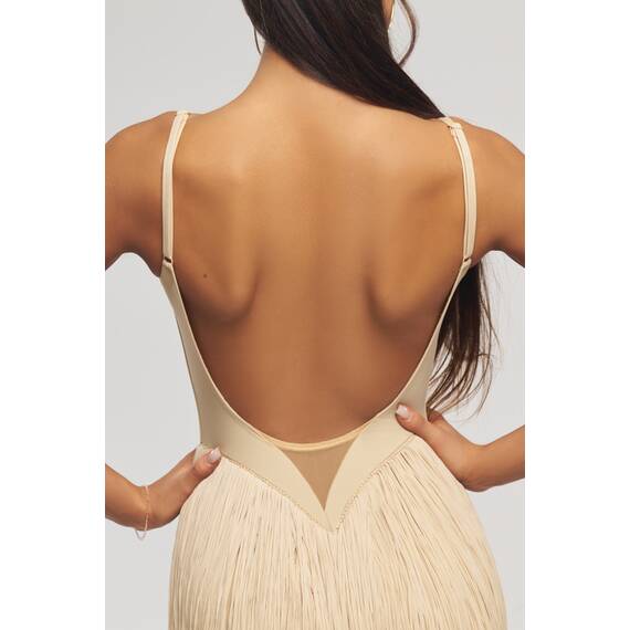 Особое внимание заслуживает роскошная бахрома-лапша, расположенная вдоль корсетных линий: она эффектно моделирует талию и добавляет динамики каждому шагу, создавая выразительный сценический образ.