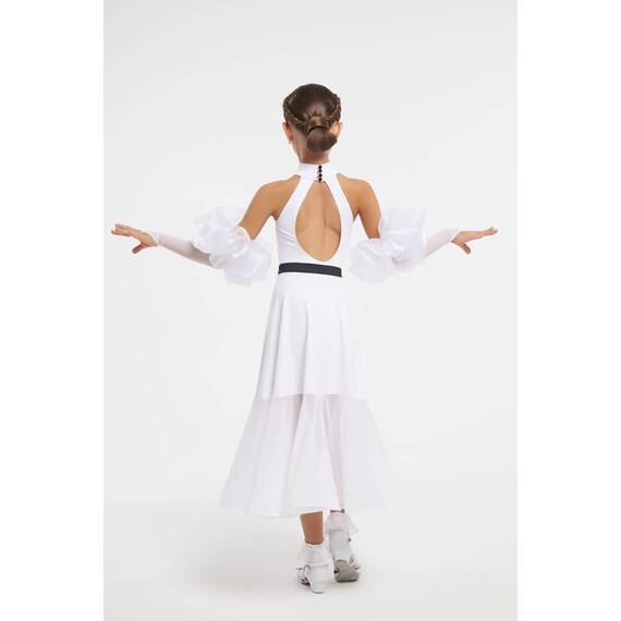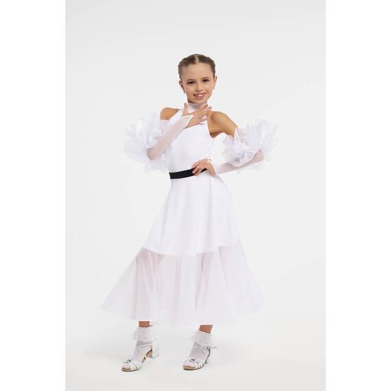 Легкое и изящное белое платье для европейской программы создано специально для юных танцовщиц, которые ценят комфорт, красоту и свободу движения. Модель выполнена из плотного эластичного трикотажа, который отлично держит форму, мягко прилегает к телу и не просвечивает даже при активных тренировках. Акцентный пояс визуально подчеркивает талию и делает силуэт более выразительным.