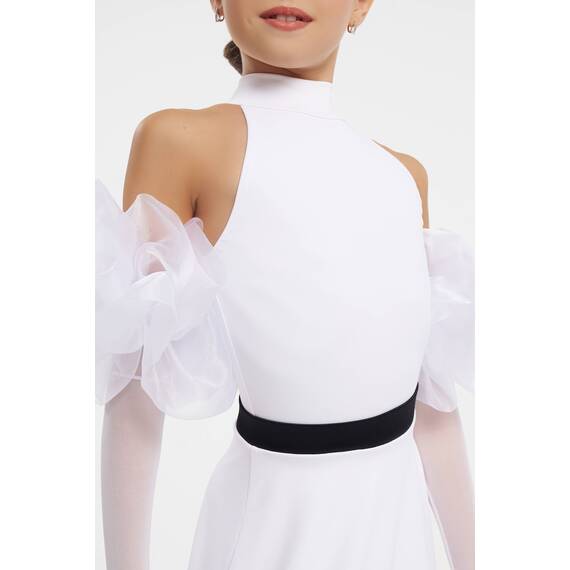 Воздушные рукава с декоративными вставками из премиальной органзы добавляют образу нежности и напоминают танцевальные костюмы профессиональных спортсменов.