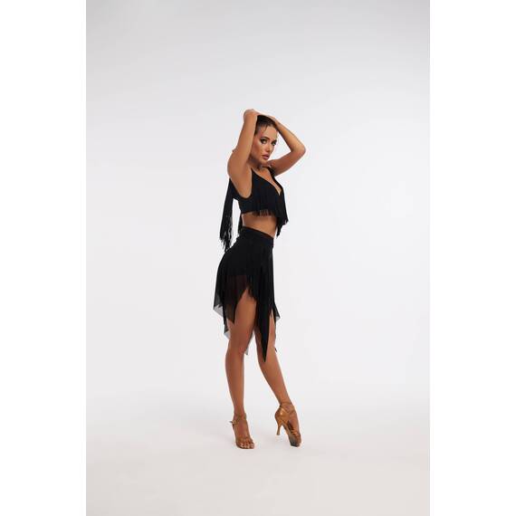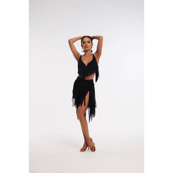 Стильный черный платок, выполненный из мягкой эластичной сетки, создан для тех, кто хочет добавить в образ больше динамики, выразительности и оригинальности. Благодаря декоративным рваным элементам и изящной длинной бахроме-лапше модель смотрится эффектно в движении, подчёркивая каждое танцевальное сочетание.