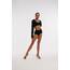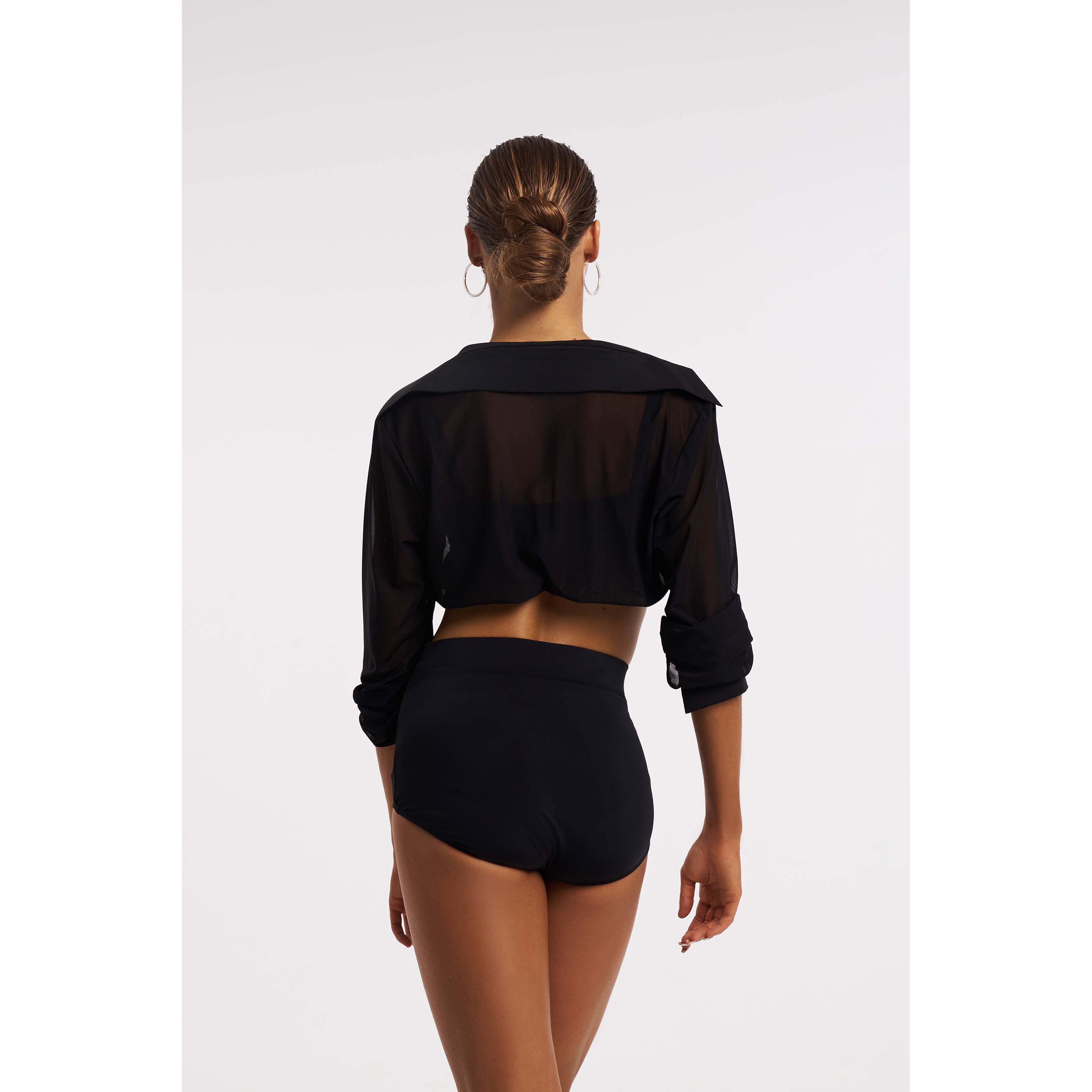 Кроп-рубашка выполнена из легкой, дышащей сетки, что идеально подходит для жаркой погоды и высокоинтенсивных занятий. Материал позволяет коже свободно дышать, сохраняя ощущение свежести даже при активной нагрузке. Комбинация сетчатой рубашки и корсетного топа формирует стильный, многослойный образ с нотами экстравагантности и артистичности.