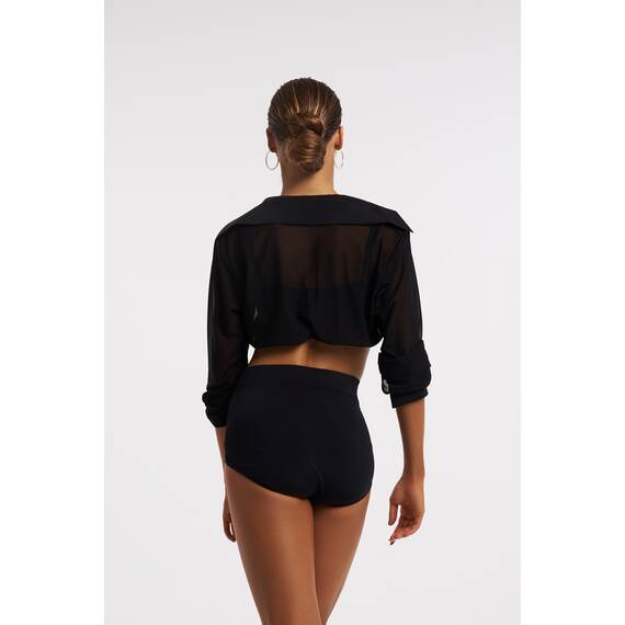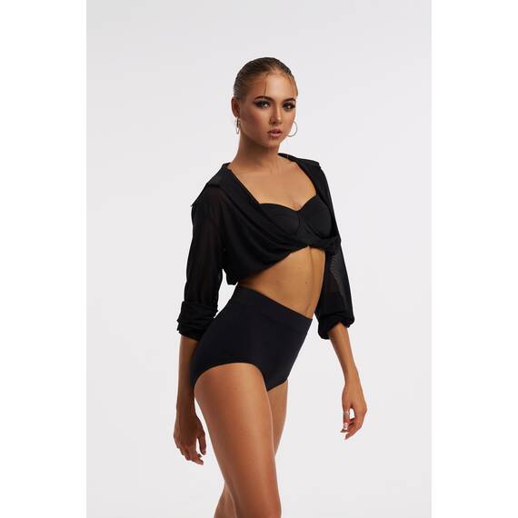 Корсетный черный топ в комплекте с кроп-рубашкой создаёт выразительный, дерзкий и современный образ, который гарантированно привлечёт внимание. Плотная конструкция топа подчёркивает линию груди и талии, а вшитые чашечки обеспечивают уверенную поддержку и комфорт в любом движении. Регулируемые лямки позволяют точно подстроить посадку под особенности фигуры, делая модель максимально удобной для танцев и активных тренировок.