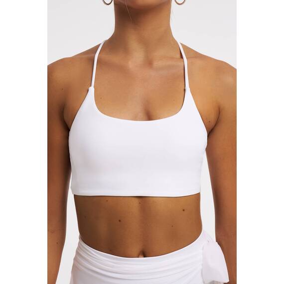 Стильный белый базовый топ создан специально для активных тренировок и повседневных образов. Легкая ткань приятно прилегает к телу, а тонкие перекрестные элементы на спине добавляют акцент и формируют выразительный силуэт. Регулируемые тонкие бретели позволяют идеально подогнать посадку под особенности фигуры, обеспечивая максимальный комфорт при движении.