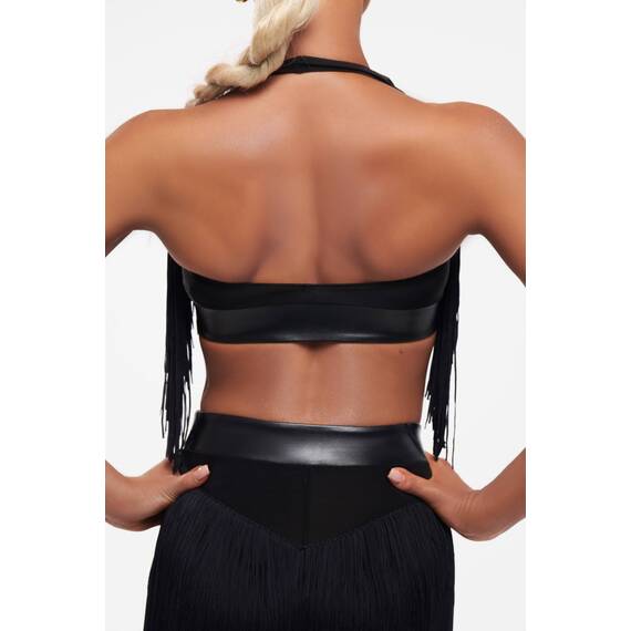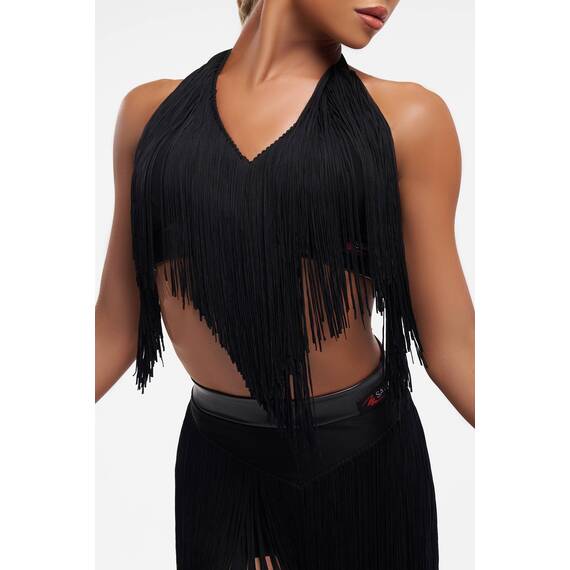 Декоративная бахрома-лапша, расположенная вдоль корсетных линий, эффектно подчёркивает форму бюста и усиливает визуальную динамику каждого движения. При поворотах и акцентах бахрома создает живой ритм, делая образ более пластичным и притягательным.