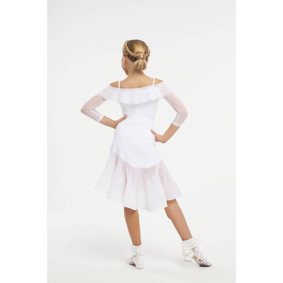 Главный акцент юбки — выразительный волан из прочной сетки, усиленной широким регилином. Такая конструкция позволяет ткани красиво раскрываться во время вращений, создавая объем и динамику, характерные для профессиональных танцевальных костюмов.