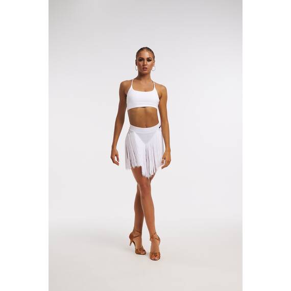 Бахрома размещена по естественным линиям тела: сзади она создает эффект лифтинга и подчёркивает изгибы, а спереди визуально вытягивает ноги, делая силуэт более стройным. При каждом шаге бахрома добавляет динамики, выразительности и визуальной скорости движений, превращая любой танцевальный элемент в эффектный и запоминающийся.