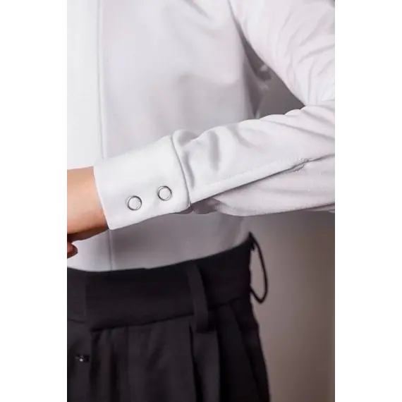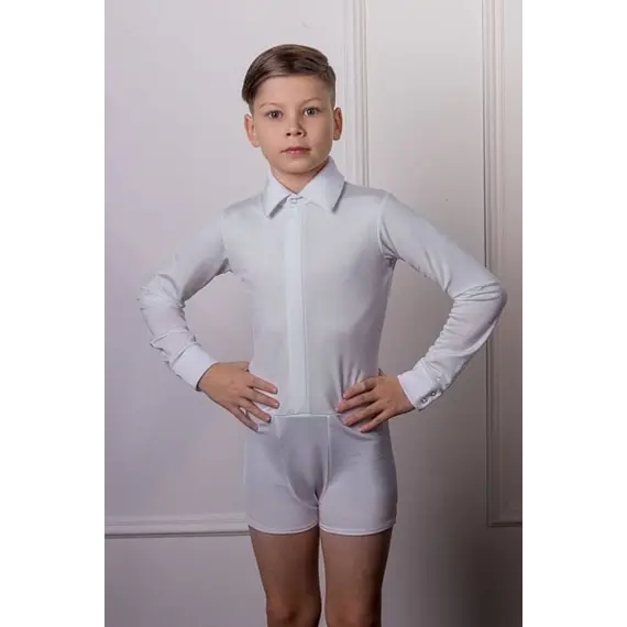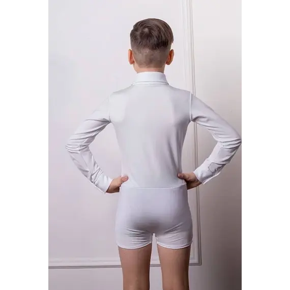 Белый цвет подчеркивает классический танцевальный стиль и придает образу элегантность. Встроенные шорты из аналогичного материала обеспечивают надежную фиксацию и избавляют от необходимости подбора дополнительной базы под рубашку.