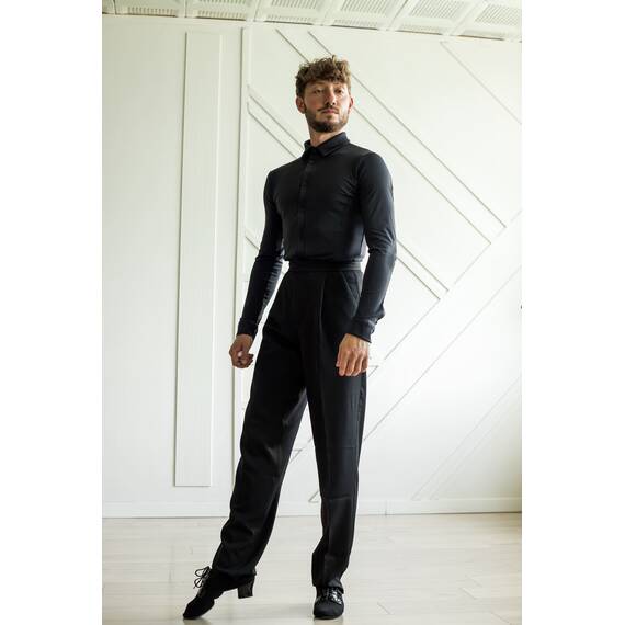 Глубокий черный цвет делает образ более строгим и сценически выразительным, а лаконичный крой акцентирует внимание на пластике танцора. Вшитые шорты из той же ткани обеспечивают надежную посадку и избавляют от необходимости подбора дополнительной экипировки.