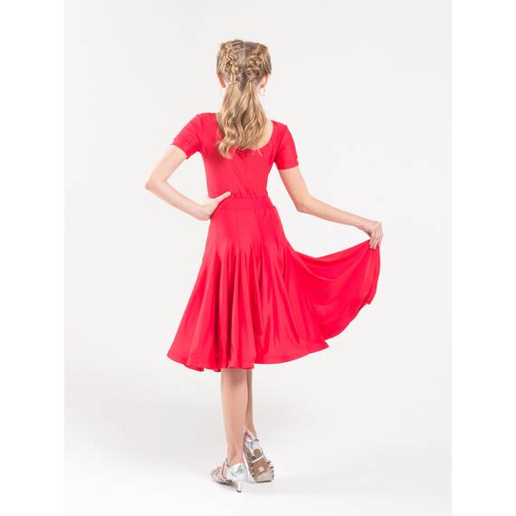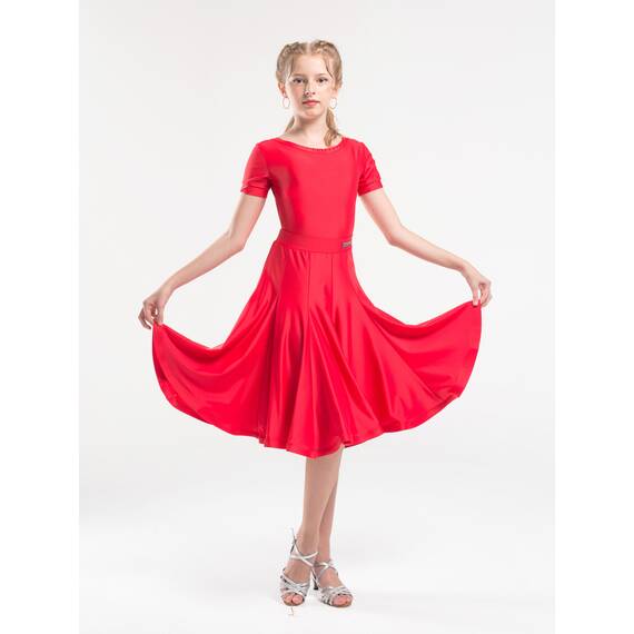 Эффектное рейтинговое платье для девочек, созданное специально для выступлений в бальных танцах. Модель отличается пышной юбкой фасона «годе», выполненной из 10 клиньев, что обеспечивает красивую динамику и выразительное движение во время танца.