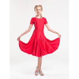 Эффектное рейтинговое платье для девочек, созданное специально для выступлений в бальных танцах. Модель отличается пышной юбкой фасона «годе», выполненной из 10 клиньев, что обеспечивает красивую динамику и выразительное движение во время танца.