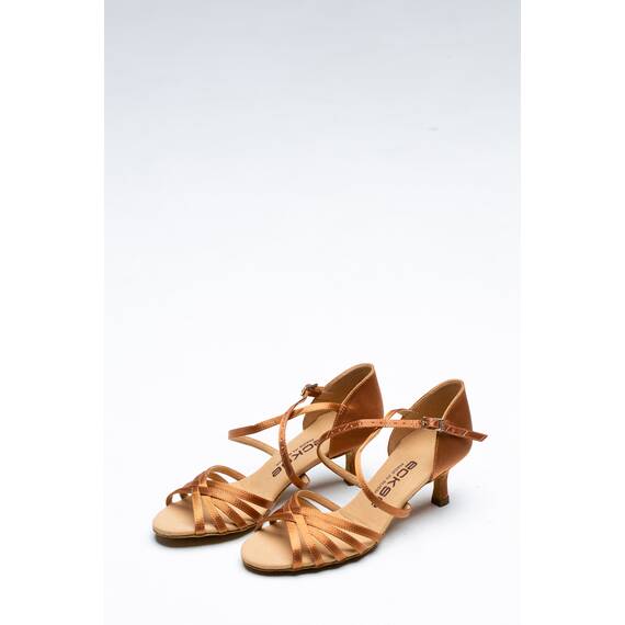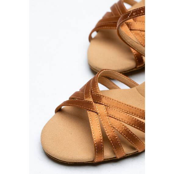 Женские туфли для латиноамериканской программы спортивных бальных танцев выполнены из сатина бронзового оттенка, который подчёркивает движения и добавляет сценическому образу выразительность. Союзка из тонких ремешков формирует лёгкий силуэт и обеспечивает стабильную фиксацию стопы без утяжеления конструкции. Внутренняя стелька с латексом повышенной плотности поддерживает комфортную посадку и снижает нагрузку при длительных тренировках и выступлениях. Модель доступна в двух вариантах полноты — средней и широкой, что позволяет адаптировать посадку под особенности стопы. Замшевая подошва обеспечивает контролируемое скольжение и надёжное сцепление с паркетом. Высота каблука указана для среднего размера и может незначительно варьироваться в зависимости от длины стопы. Длина стельки соответствует размеру с прибавкой около 0,5 см для комфортной посадки.