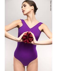 Дизайн.  Фиолетовый открытый балетный купальник на широких лямках. Треугольный вырез спереди и со спины, комфортная широкая лямка 4 см. Углубленная форма проймы. Лиф и спинка купальника дополнены подкладкой. Фиолетовое боди с открытой спиной и глубоким вырезом.  Материал....