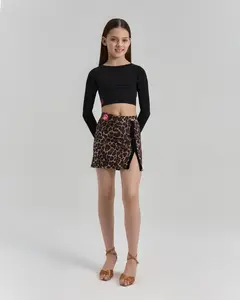 Детская мини-юбка PRIMABELLA для латины в леопардовом принте с бархатной отделкой и вырезом по ноге. Эластичная ткань и встроенные трусики обеспечивают свободу движений и комфорт.