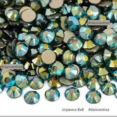 Клеевые стразы Blue zircon AB класса люкс с огранкой 8x8, размер SS16. Голубо-зеленый оттенок с радужным покрытием AB. Холодная фиксация на прозрачный клей. Для бальных танцев, сцены и купальников по художественной гимнастике.