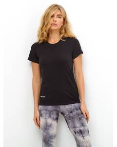 Комфортная женская футболка из хлопка с эластаном, идеально подходящая для йоги и спорта. Приталенный крой, удобная длина и лаконичный брендовый дизайн обеспечивают свободу движения и стильный вид.