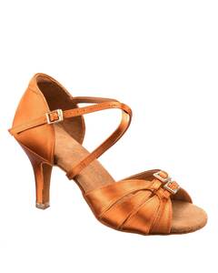 Женские туфли BD Dance 2307 из бронзового сатина для латины. X-образная фиксация, каблуки 5,5 см клеш и 8,5 см Slim, гибкая замшевая подошва и комфортная посадка.