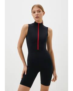 Дизайн.  Тренировочный комбинезон черного цвета без рукавов с воротником-стойкой на молнии, которая дает вам выбор — застегиваться или расстегиваться. Этот комбинезон на молнии — комбинация двух базовых моделей: купальника и велосипедок. Подкладка спереди гарантирует...