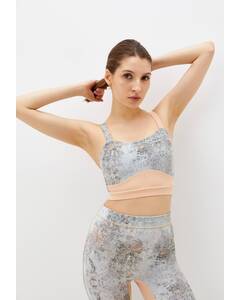 Дизайн.  Бежевый спортивный топ на лямках. Усовершенствованная модель с цельнокроеным поясом. Углубленная спинка обеспечивает комфортную посадку. Продуманный дизайн и крой подходит для интенсивных тренировок. Упругая лямка изготовлена на специализированном оборудовании. Деталь лифа...