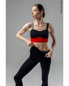 Дизайн.  Черный спортивный топ на лямках. Усовершенствованная модель с цельнокроеным поясом. Углубленная спинка обеспечивает комфортную посадку. Продуманный дизайн и крой подходит для интенсивных тренировок. Упругая лямка изготовлена на специализированном оборудовании. Деталь лифа спереди...