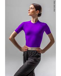 Дизайн.  Серый-фиолетовый спортивный кроп топ на молнии. Плотно прилегающий крой ощущается, как вторая кожа, с лёгким эффектом пуш-ап. Молния с контрастным пуллером. Серый-фиолетовый закрытый верх купальника. Топ на молнии для танцев.  Материал.  Итальянский бифлекс —...