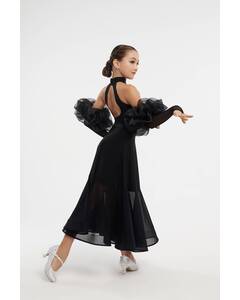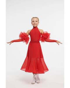 Легкое танцевальное платье для европейской программы: плотный трикотаж, сетчатая юбка с регилином, воздушные рукава из органзы, удобный подьюбник и изящный вырез на спине. Идеально для тренировок и выступлений.