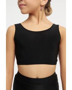 Легкий укороченный черный топ с регулируемыми бретелями и вшитыми чашками. Бахрома-лапша по корсетным линиям подчеркивает силуэт и добавляет движения. Идеален для тренировок и танцев в жаркую погоду.