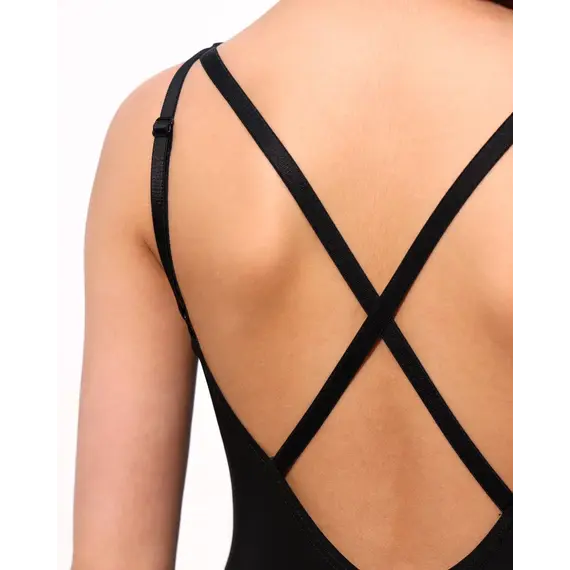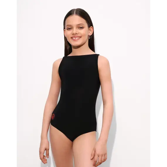 Две тонкие бретели создают изящное перекрестие на открытой спине, подчёркивая линию плеч и добавляя сценической лёгкости силуэту. Прилегающий крой делает посадку аккуратной и подчёркивает точность движений юной танцовщицы. Модель подходит для репетиций, выступлений, постановочных номеров и фотосъёмок.