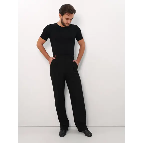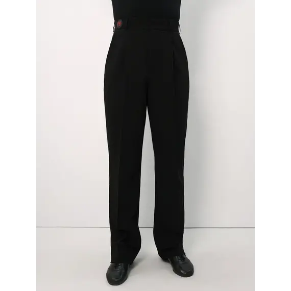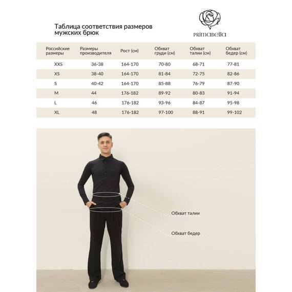 Мужские брюки Primabella для стандартной программы разработаны с учётом особенностей бальных танцев и требований к сценическому внешнему виду. Прямой силуэт с аккуратными отстроченными стрелками формирует чистую линию ноги и помогает сохранить строгий образ на паркете. Модель оснащена застёжкой на крючках, гульфиком на молнии и шлёвками под ремень, что позволяет обеспечить стабильную посадку и адаптировать брюки под индивидуальные предпочтения танцовщика.